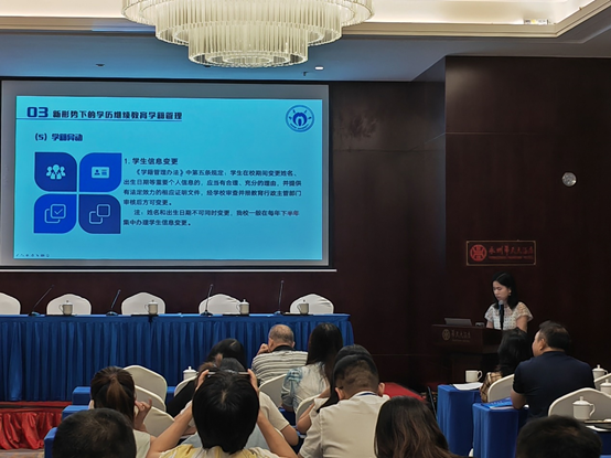 工作会议之后,由继续教育学院赵桂芝副院长主持,会议进行了三个业务专题培训。继续教育学院招生与教务办公室主任汤晓兰、校外教学点管理办公室主任彭金生和湖南世纪超星公司刘人洋分别做了《新形势下中国电竞官方网校外教学点教学与学籍管理》《新时代下中国电竞官方网教学点设置与管理》;《中国电竞官方网校外教学信息化管理系统操作》专题培训。
